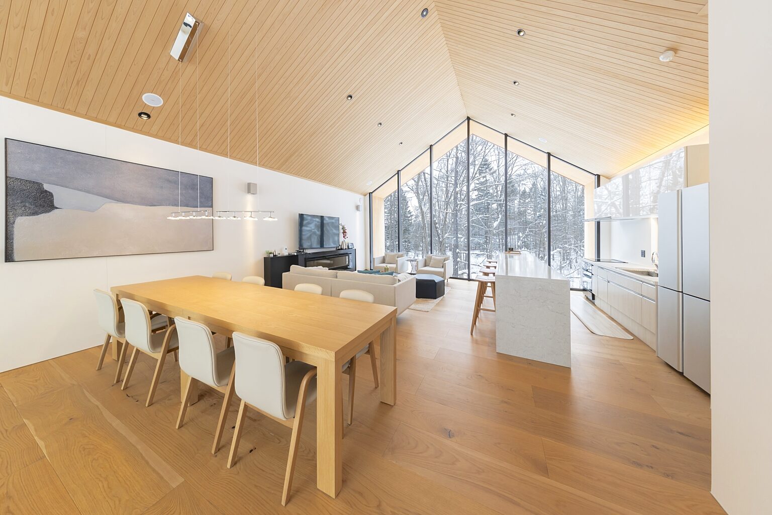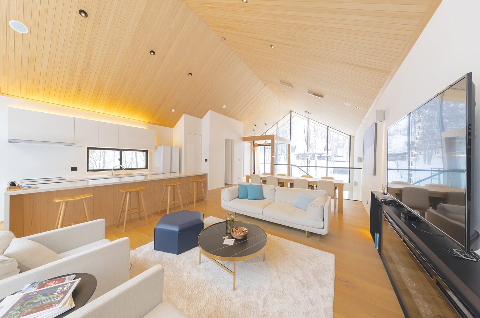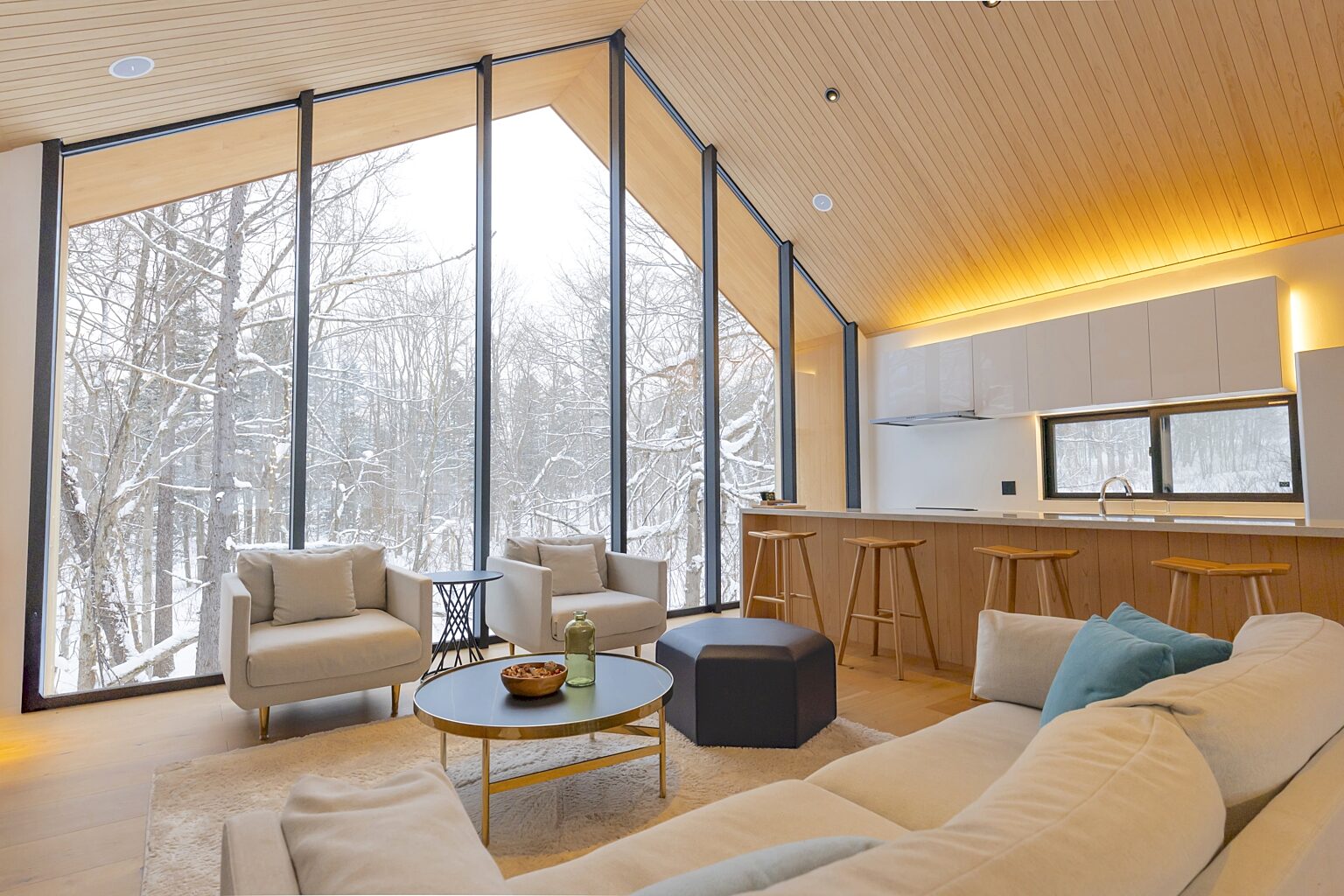 Kouzan Woodsは、ヒラフスキー場とニセコビレッジスキー場の中間に位置する3ベッドルームのデザイナーズキャビンです。大きな窓と高い天井が明るく、周囲の自然をリビングルームに取り込みます。