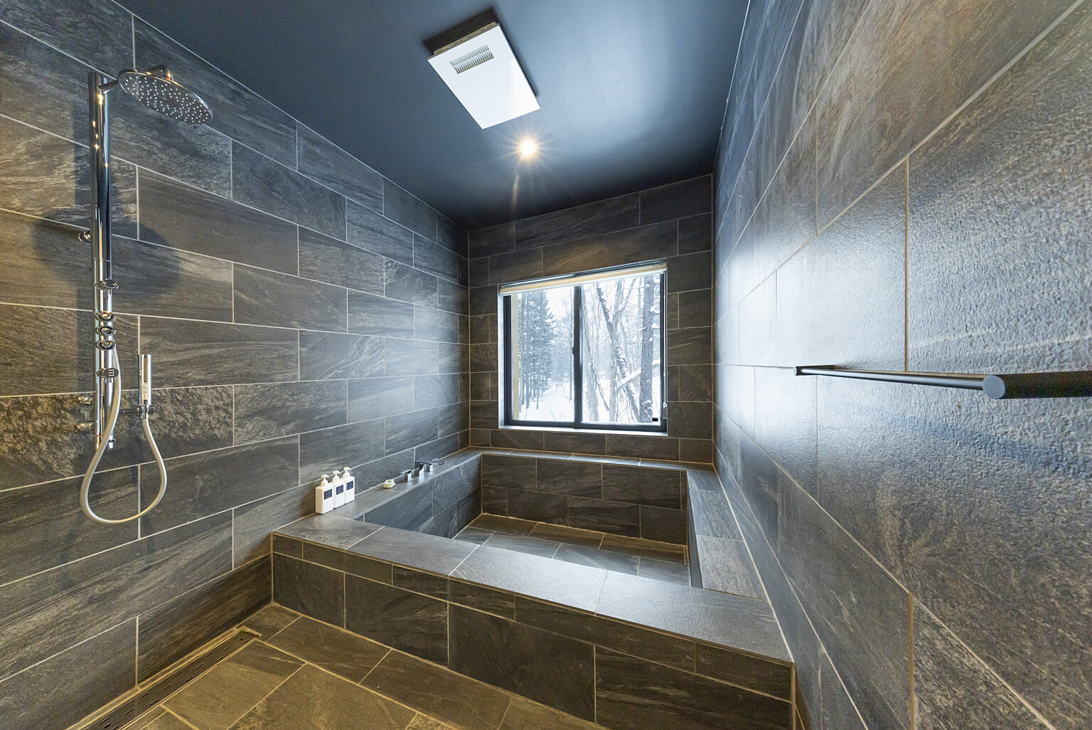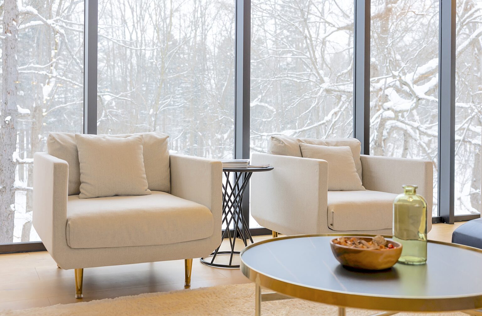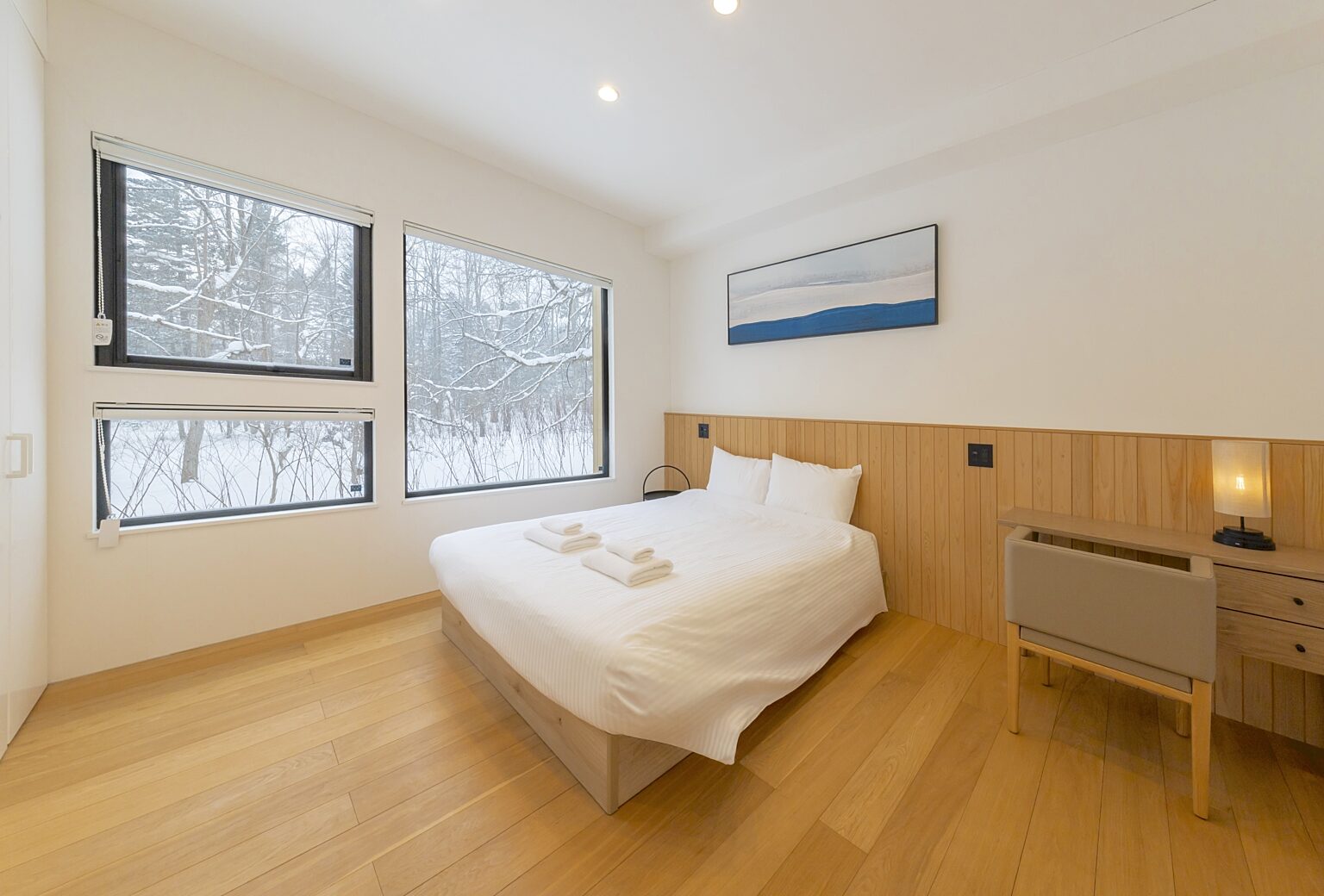 Kouzan Woodsは、ヒラフスキー場とニセコビレッジスキー場の中間に位置する3ベッドルームのデザイナーズキャビンです。大きな窓と高い天井が明るく、周囲の自然をリビングルームに取り込みます。